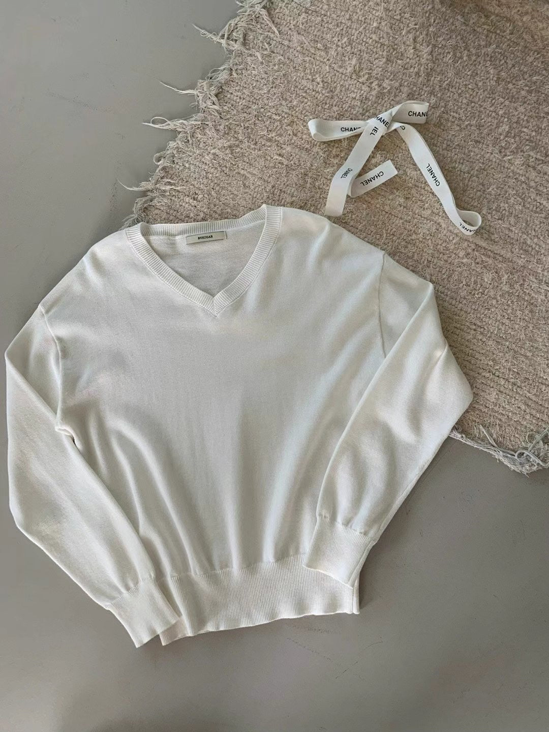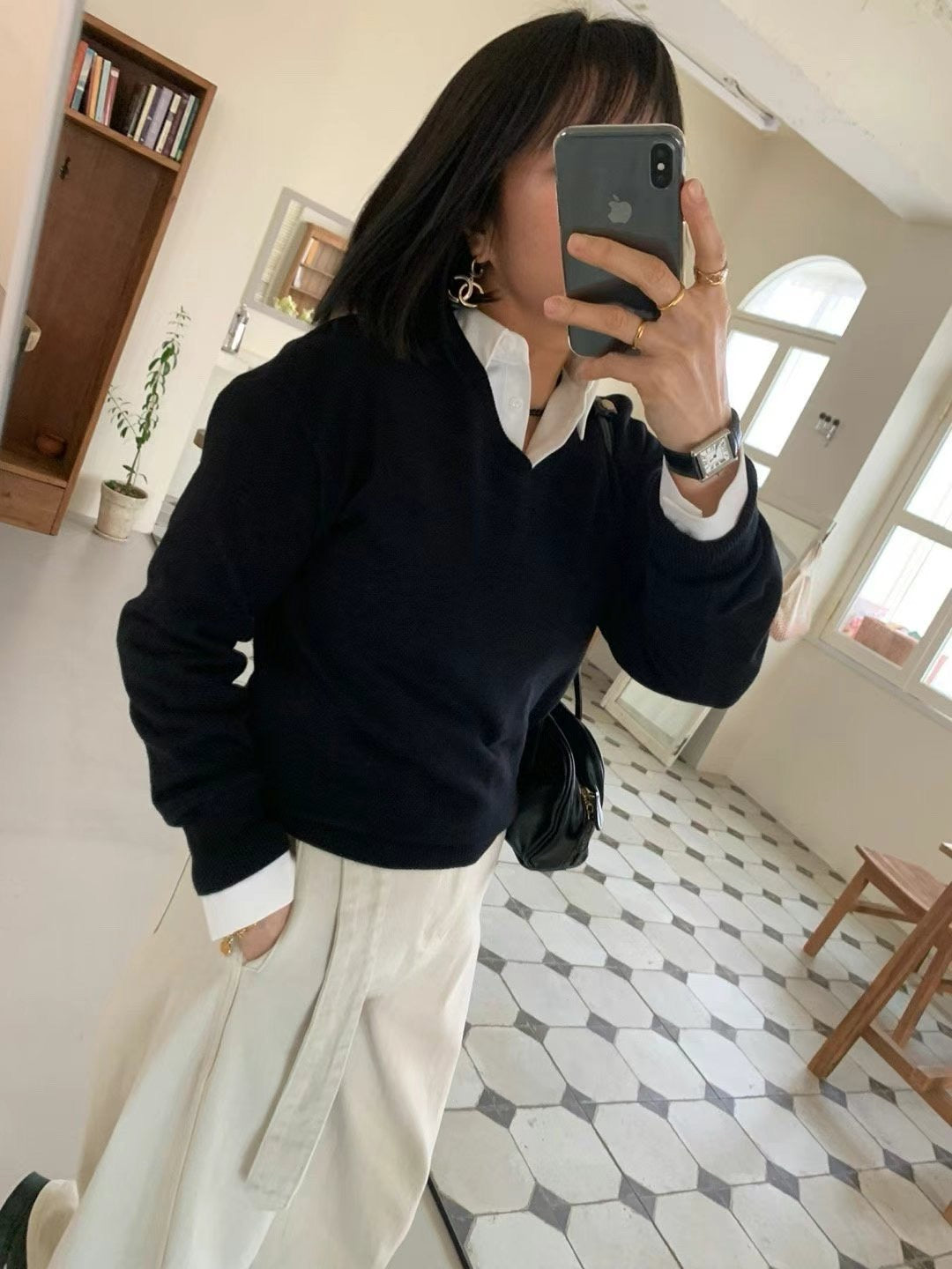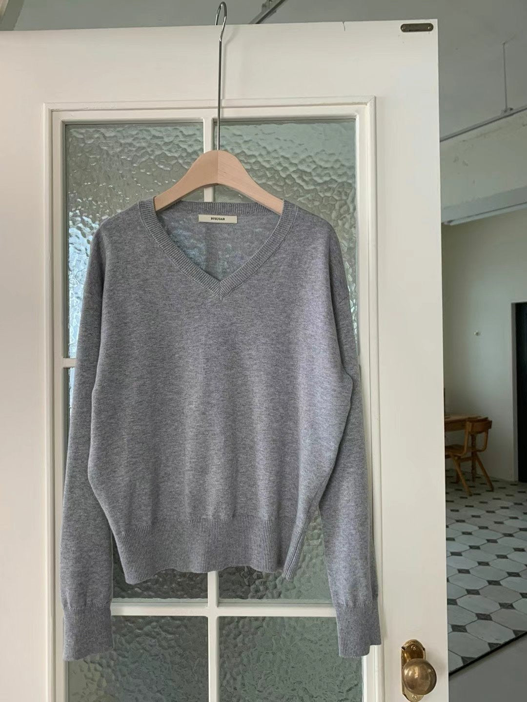 這款v領針織採用春夏較舒適輕薄的羊毛混紡面料製成袖口和下擺採用羅紋設計。