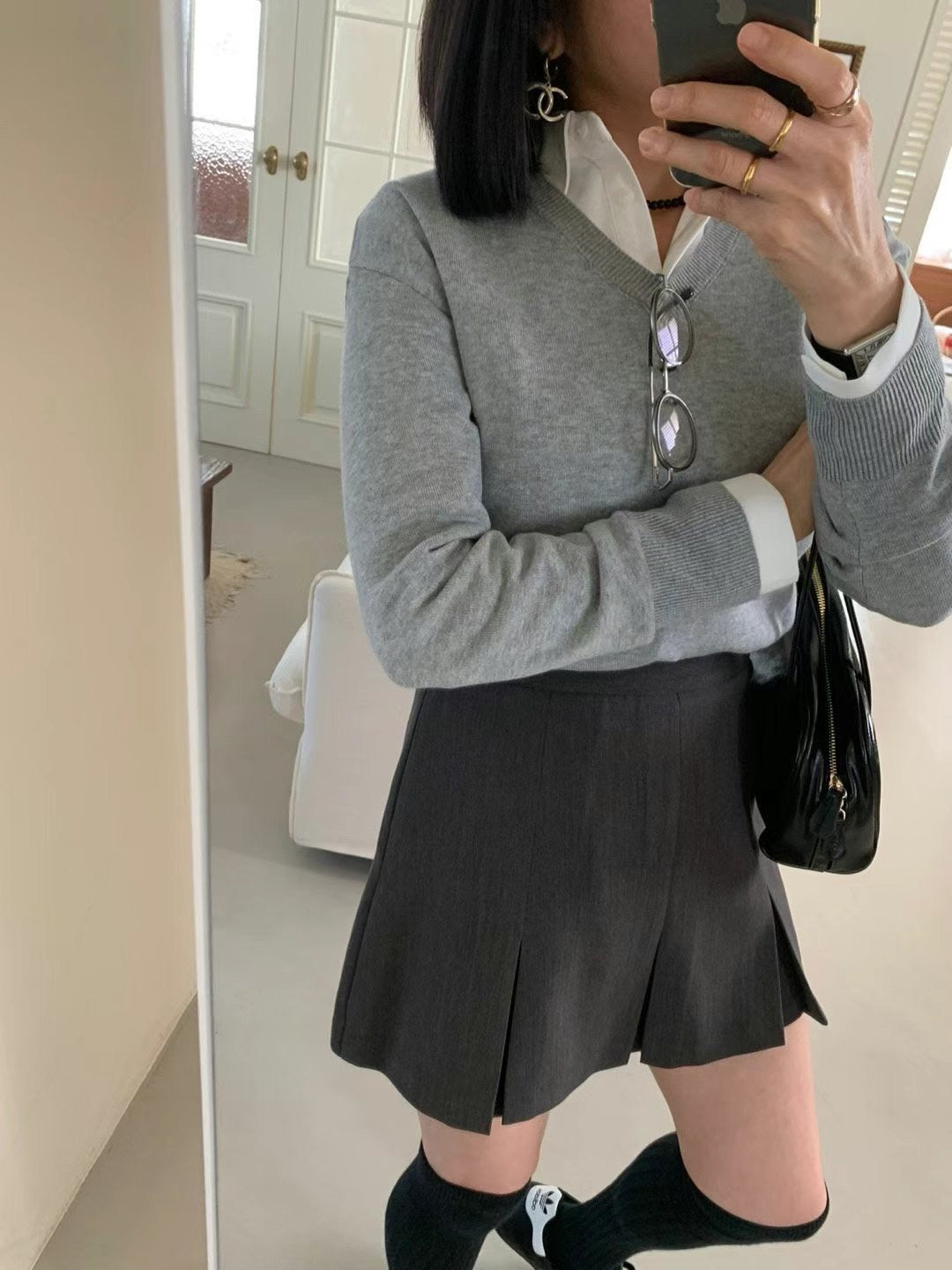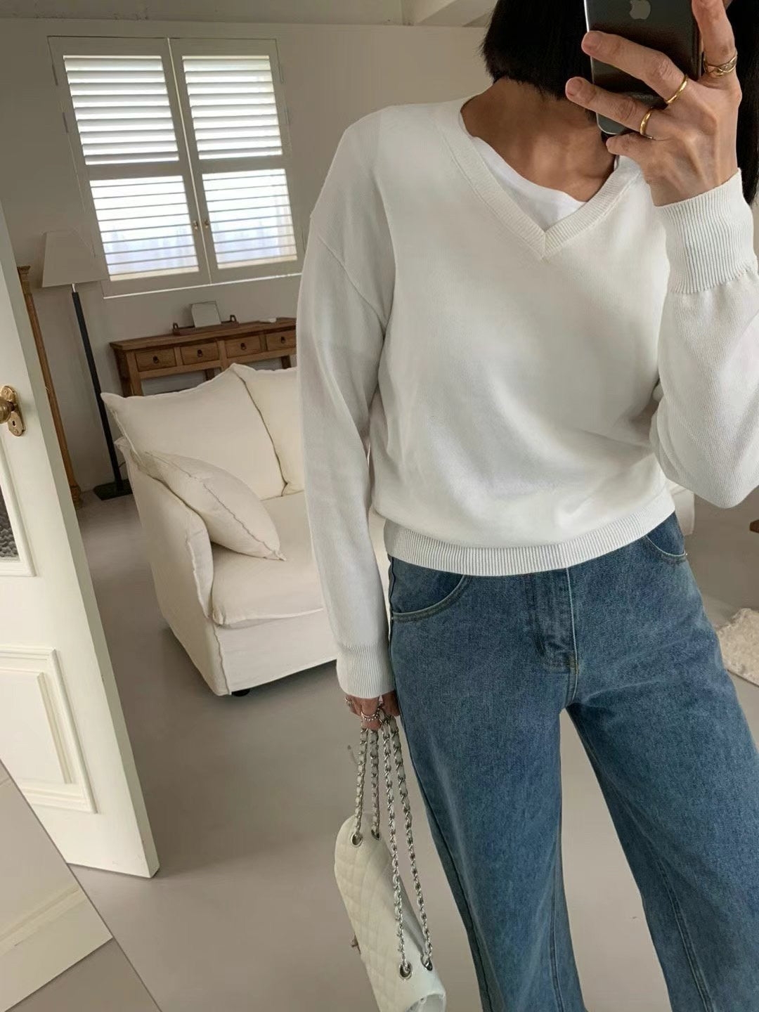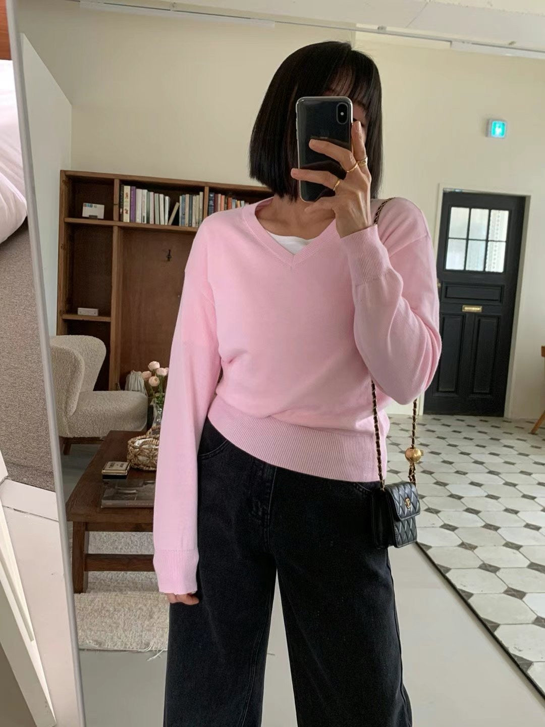 這款v領針織採用春夏較舒適輕薄的羊毛混紡面料製成袖口和下擺採用羅紋設計。