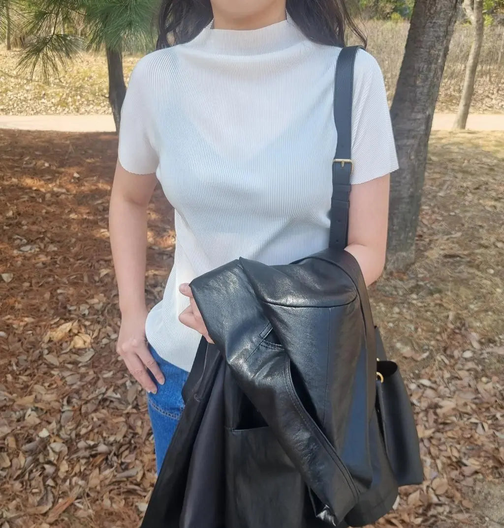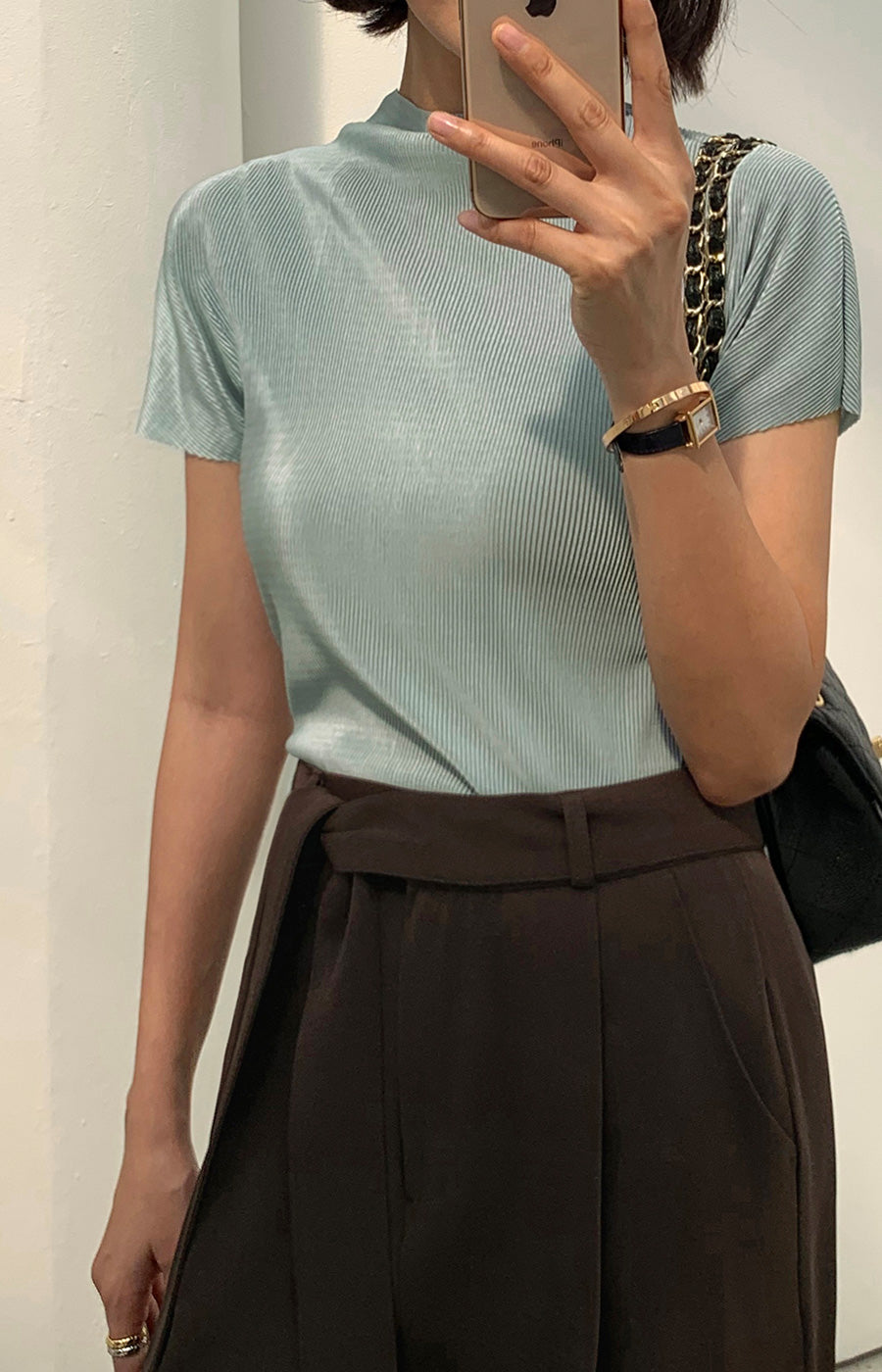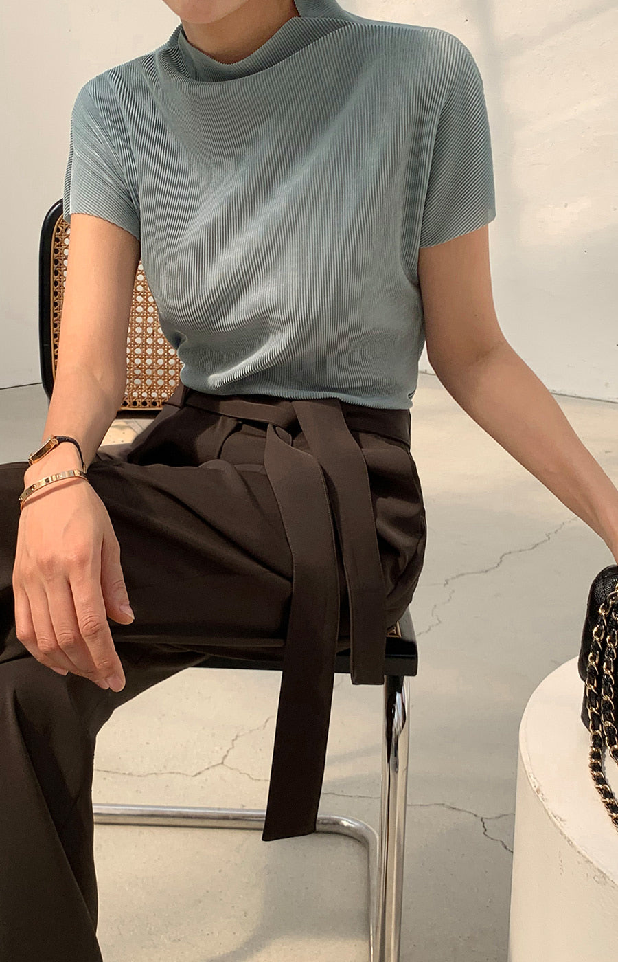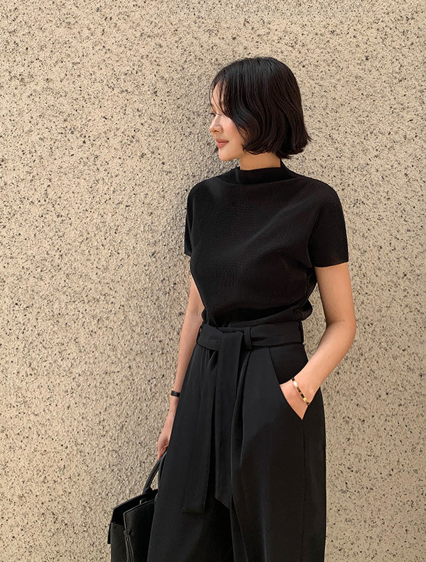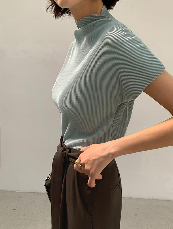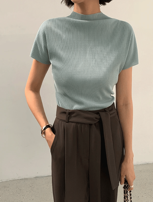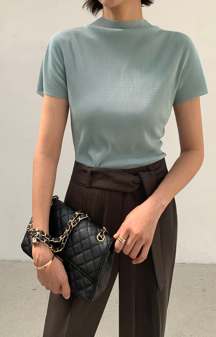 半高領的設計既不悶熱也不厚重,配上輕盈微透的材質與俐落的縱壓紋,整體散發出一種簡潔又優雅的質感氣息。